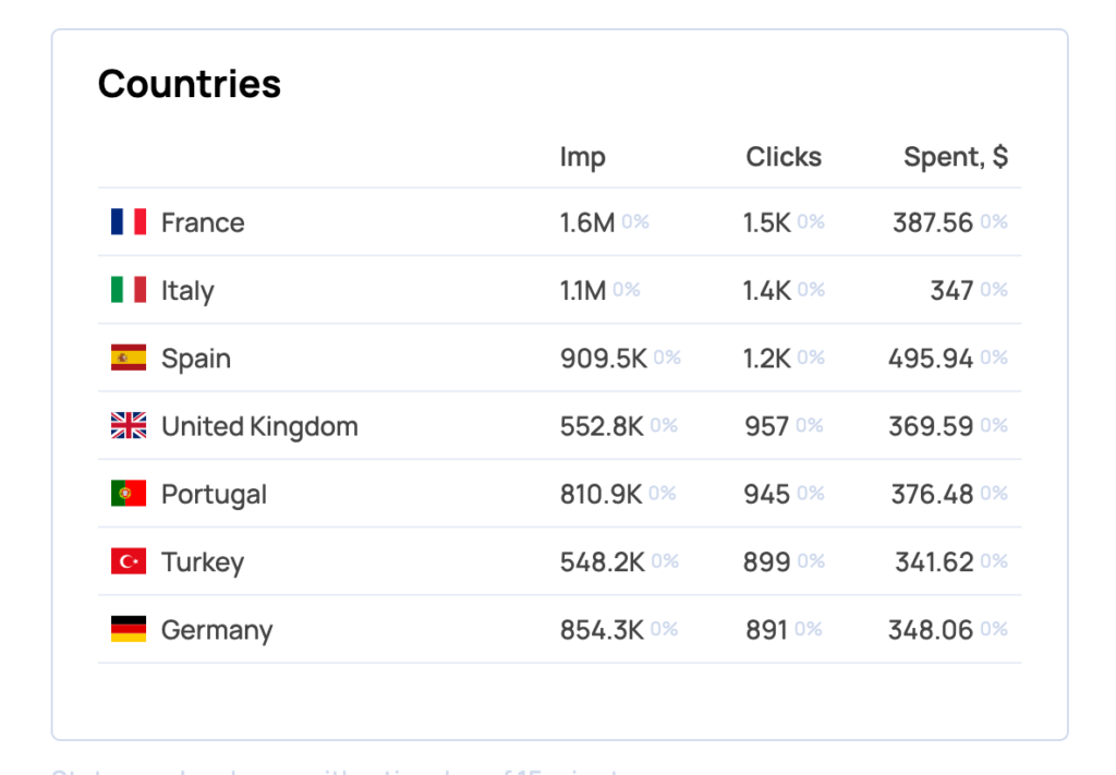 - Spain: 727,459 imp → 1,015 clicks → $415.30 → CTR 0.14% → CPC $0.41